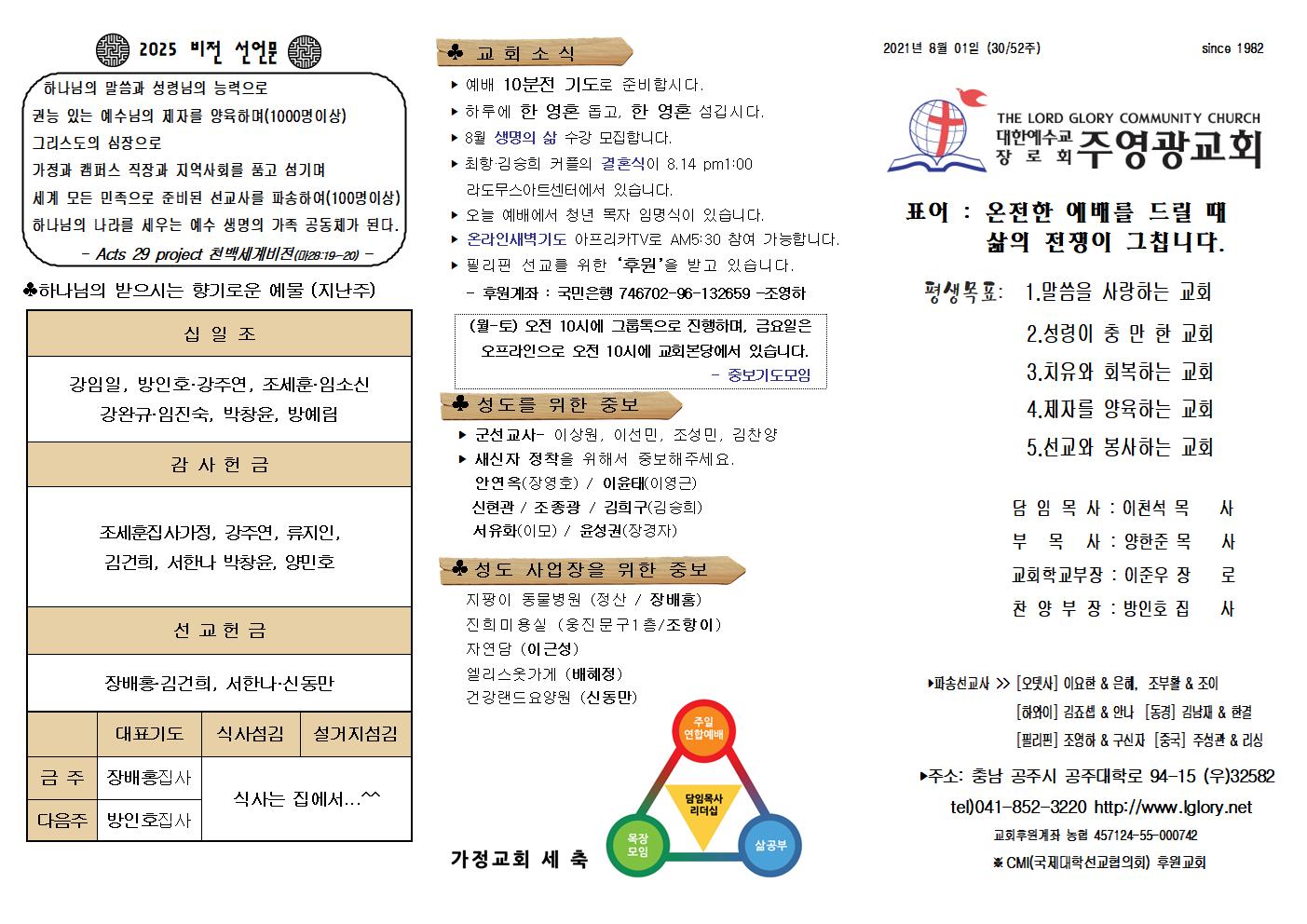 | 다음글 | 2021년 7월 25일 주영광주보입니다. | 운영자 | 2021.07.24 | 0 | 946 |
