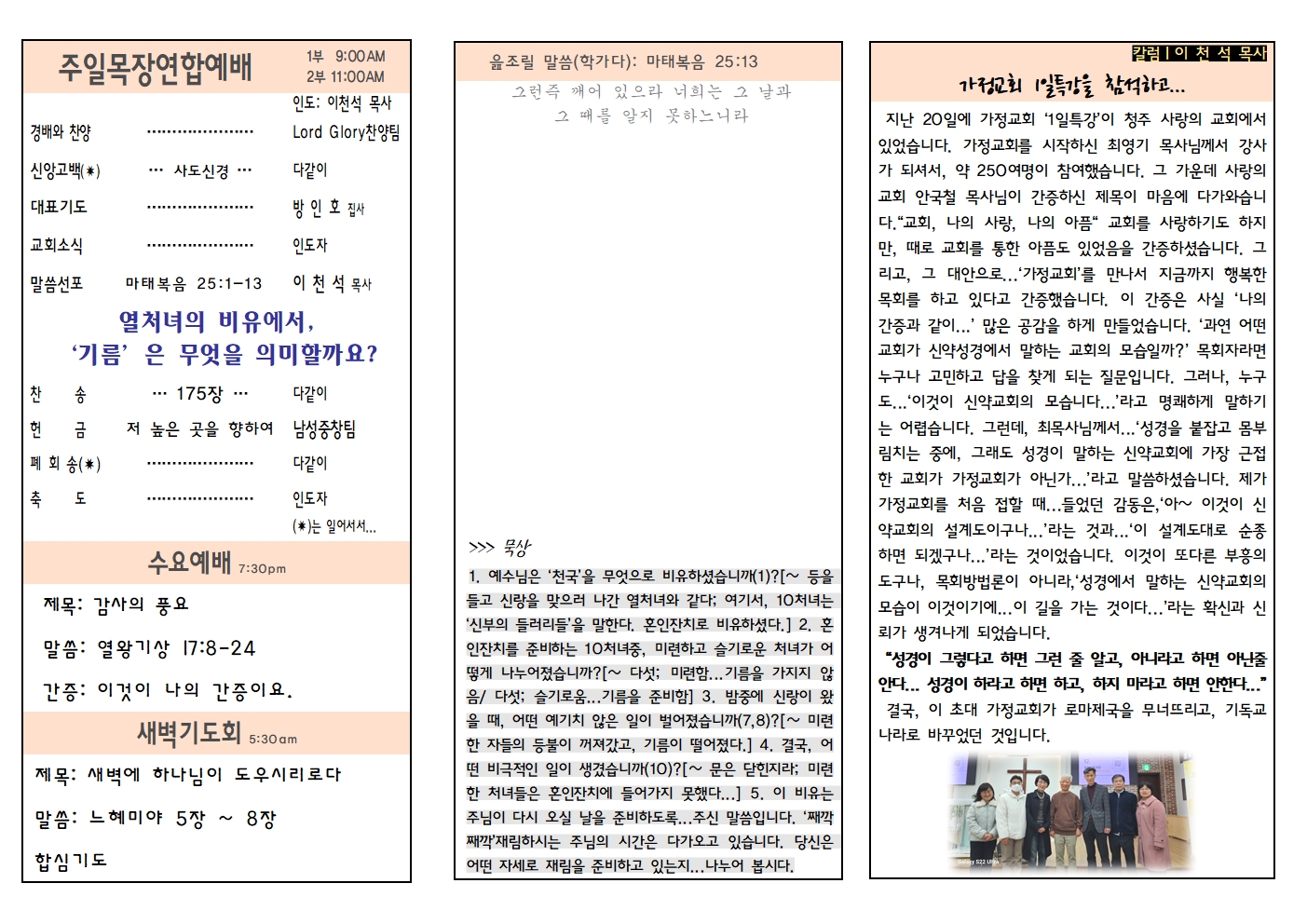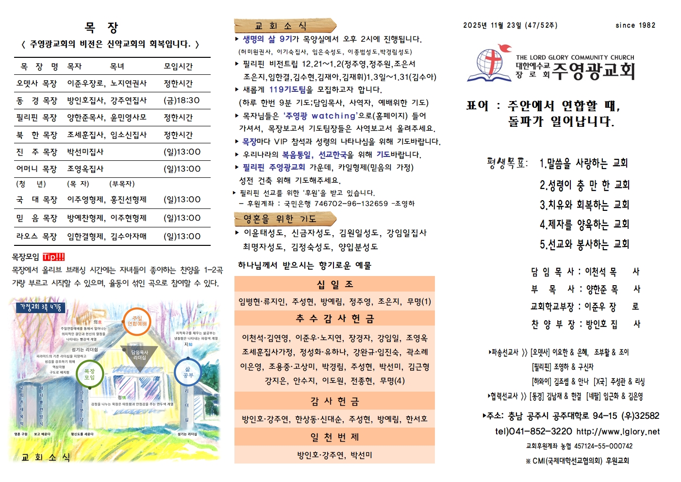 | 다음글 | 2025년 11월 16일 주영광주보입니다. | 양한준 | 2026.03.11 | 0 | 13 |