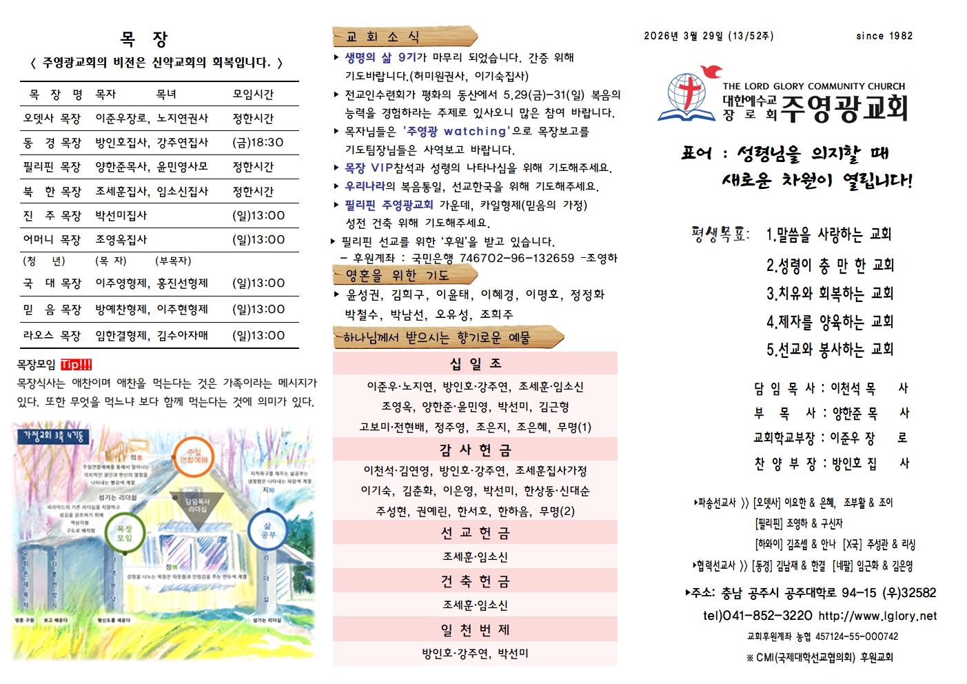 | 다음글 | 2026년 3월 22일 주영광주보입니다. | 운영자 | 2026.03.29 | 0 | 10 |
