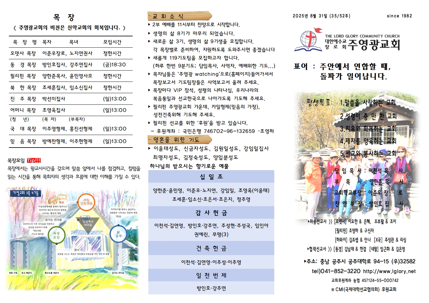 다음글 | 2025년 8월 24일 주영광주보입니다. | 운영자 | 2025.08.24 | 0 | 89 |